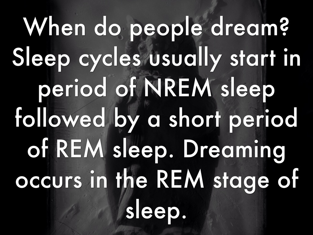 Sleep cycles usually start in period of NREM sleep followed by a short period of REM sleep. Dreaming occurs in the REM stage of sleep.