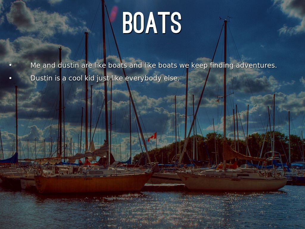 • Me and dustin are like boats and like boats we keep finding adventures.