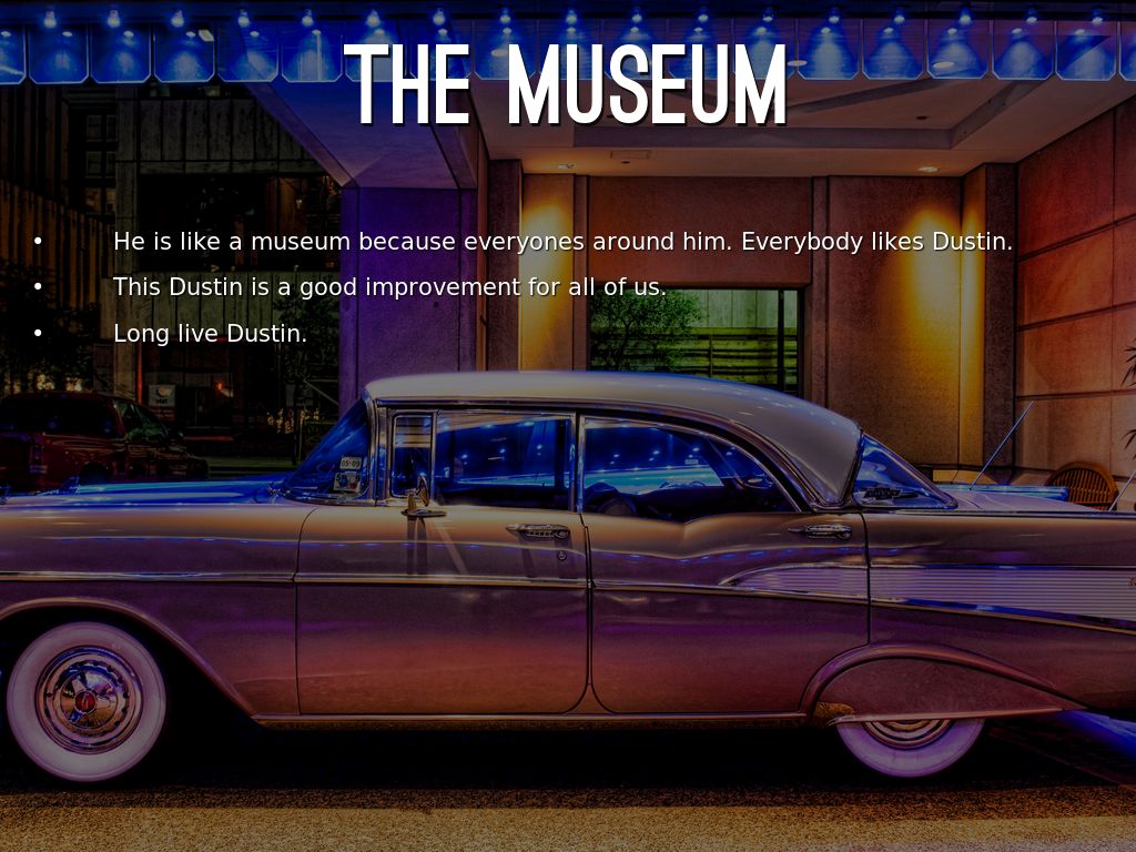 • He is like a museum because everyones around him. Everybody likes Dustin.