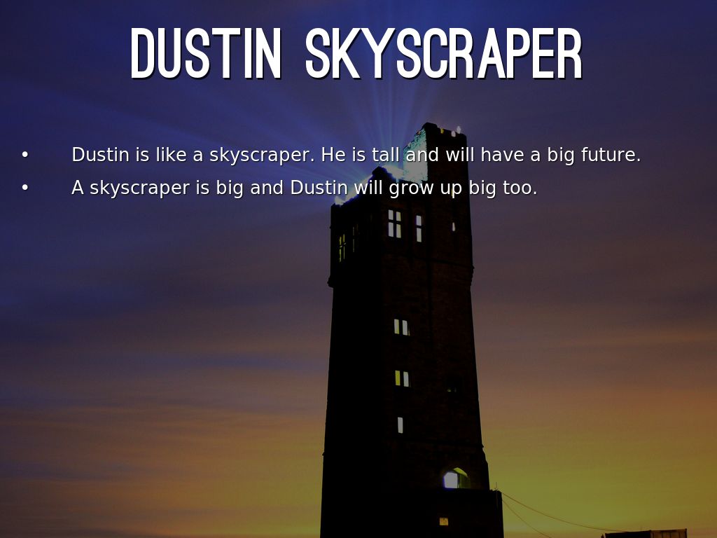 • Dustin is like a skyscraper. He is tall and will have a big future.