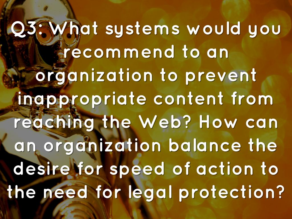 Q3: What systems would you recommend to an organization to prevent inappropriate content from reaching the Web? How can an organization balance the desire for speed of action to the need for legal protection?