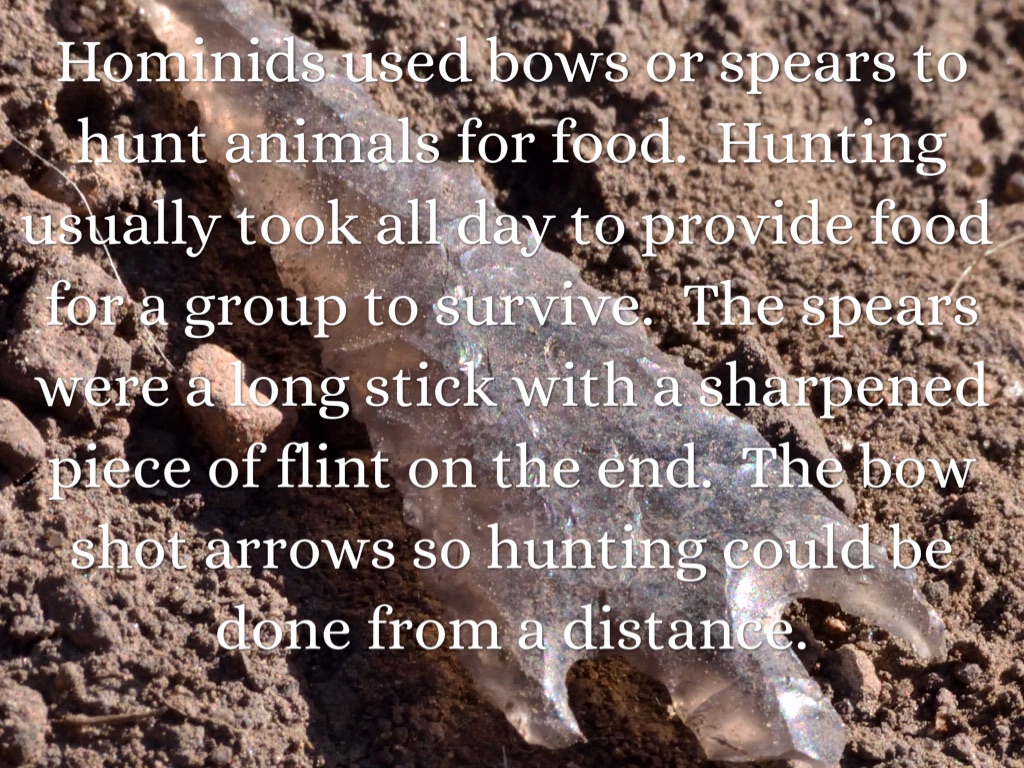 Hominids used bows or spears to hunt animals for food. Hunting usually took all day to provide food for a group to survive. The spears were a long stick with a sharpened piece of flint on the end. The bow shot arrows so hunting could be done from a distance.
