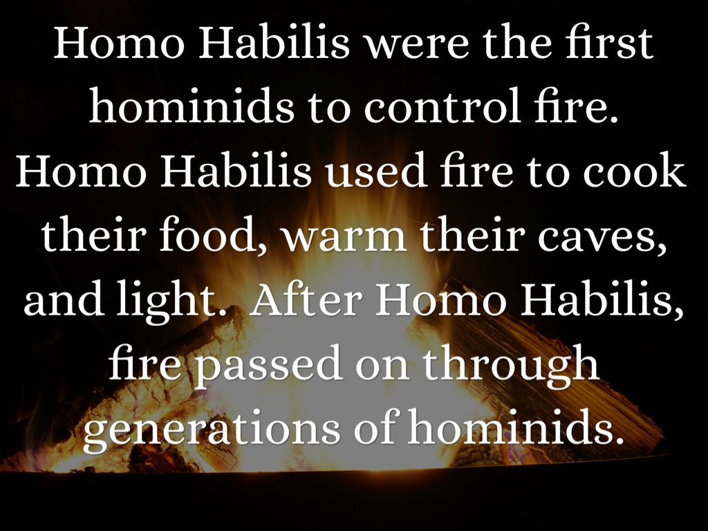 Homo Habilis were the first hominids to control fire. Homo Habilis used fire to cook their food, warm their caves, and light. After Homo Habilis, fire passed on through generations of hominids.