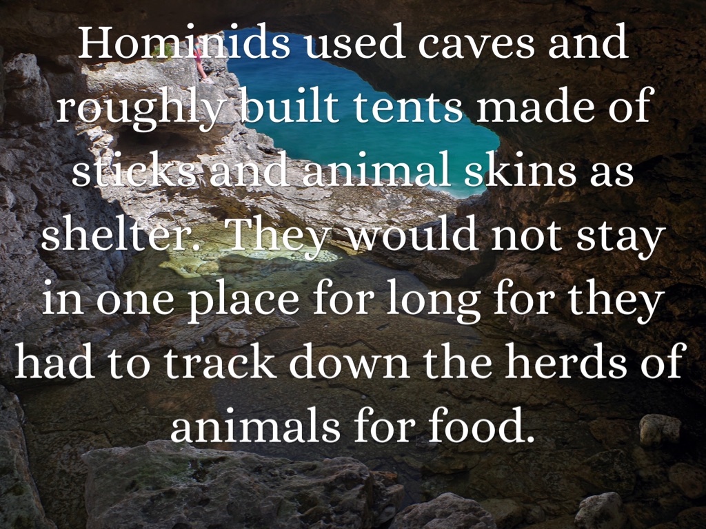 Hominids used caves and roughly built tents made of sticks and animal skins as shelter. They would not stay in one place for long for they had to track down the herds of animals for food.