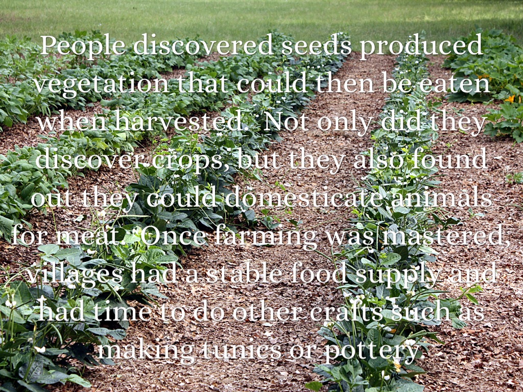 People discovered seeds produced vegetation that could then be eaten when harvested. Not only did they discover crops, but they also found out they could domesticate animals for meat. Once farming was mastered, villages had a stable food supply and had time to do other crafts such as making tunics or pottery.