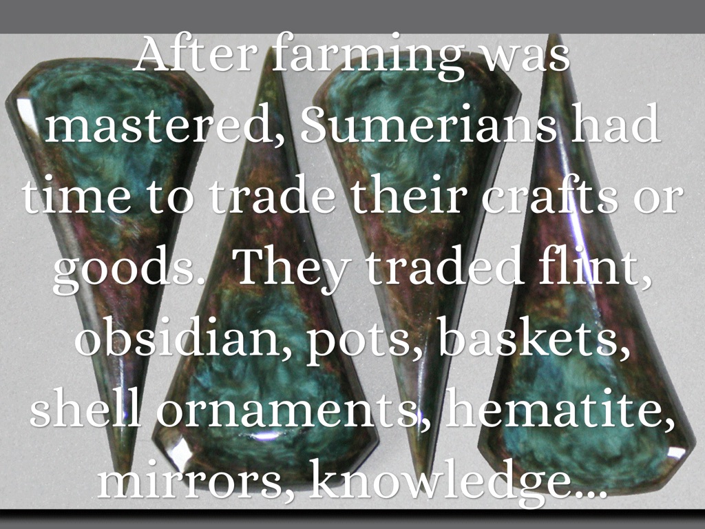 After farming was mastered, Sumerians had time to trade their crafts or goods. They traded flint, obsidian, pots, baskets, shell ornaments, hematite, mirrors, knowledge...