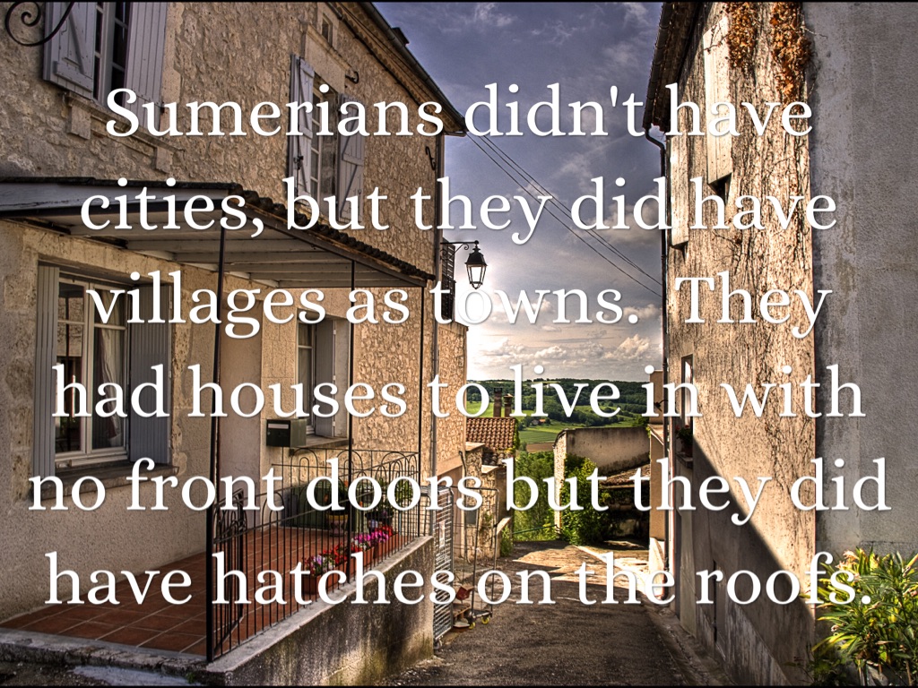 Sumerians didn't have cities, but they did have villages as towns. They had houses to live in with no front doors but they did have hatches on the roofs.