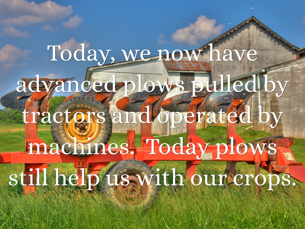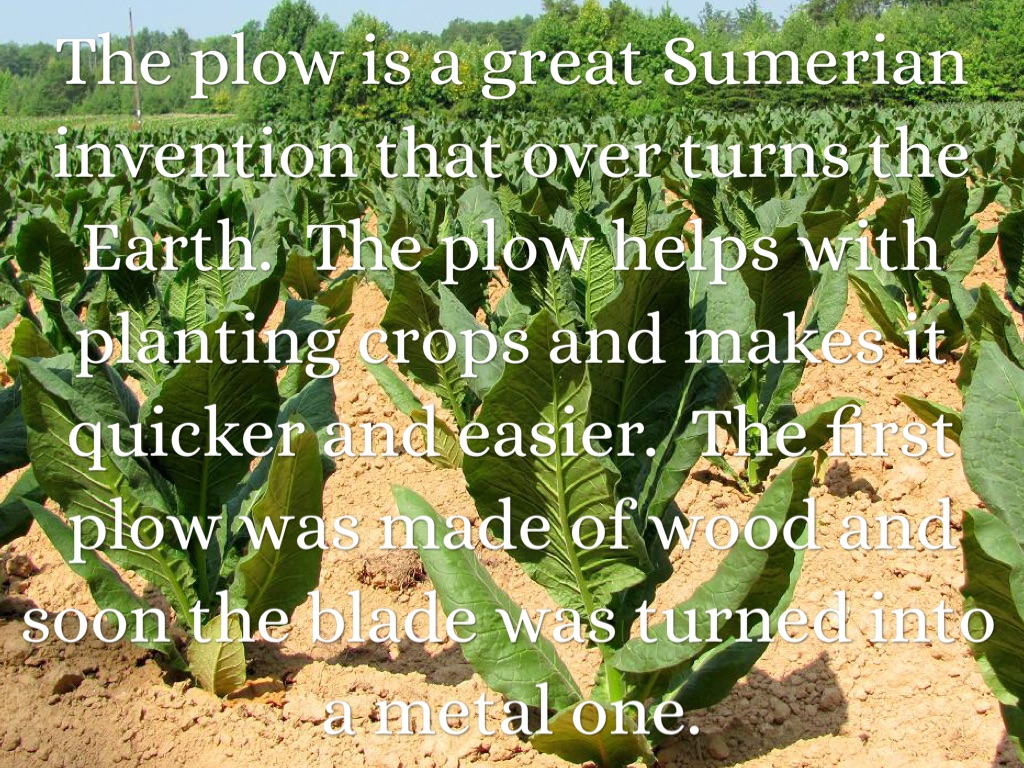 The plow is a great Sumerian invention that over turns the Earth. The plow helps with planting crops and makes it quicker and easier. The first plow was made of wood and soon the blade was turned into a metal one.
