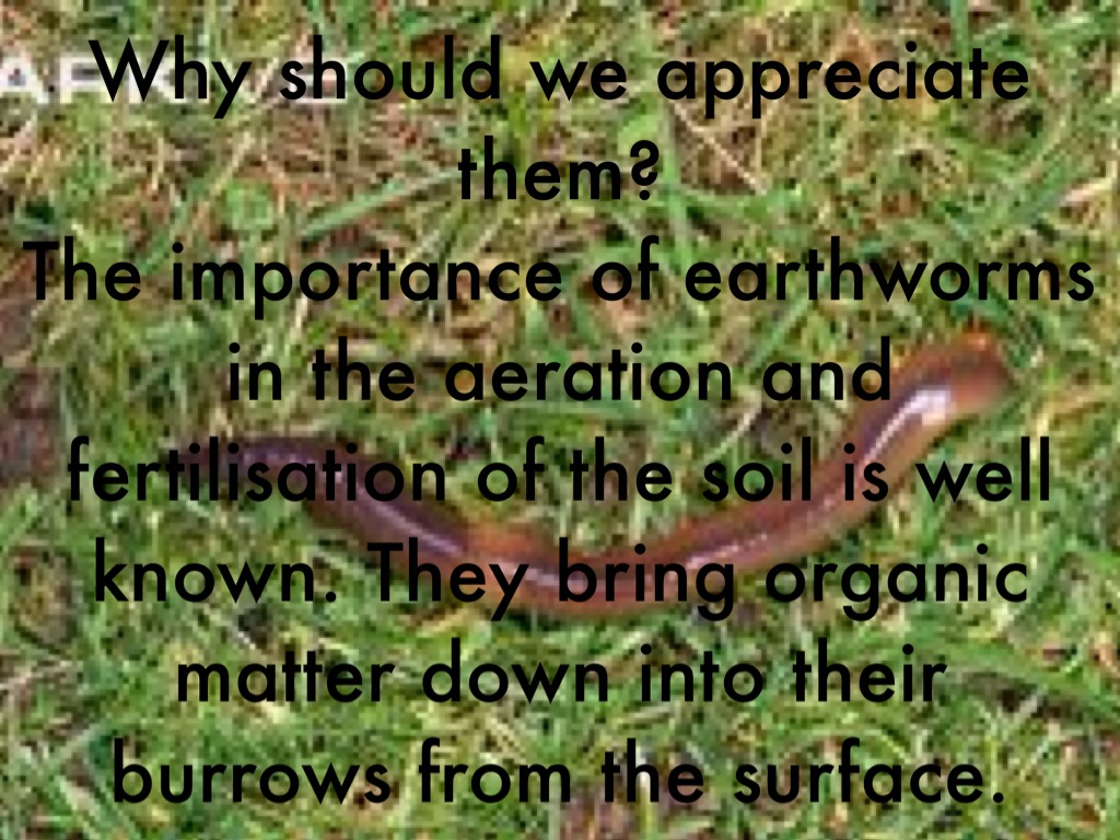 The importance of earthworms in the aeration and fertilisation of the soil is well known. They bring organic matter down into their burrows from the surface.