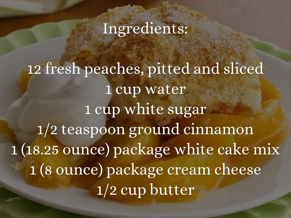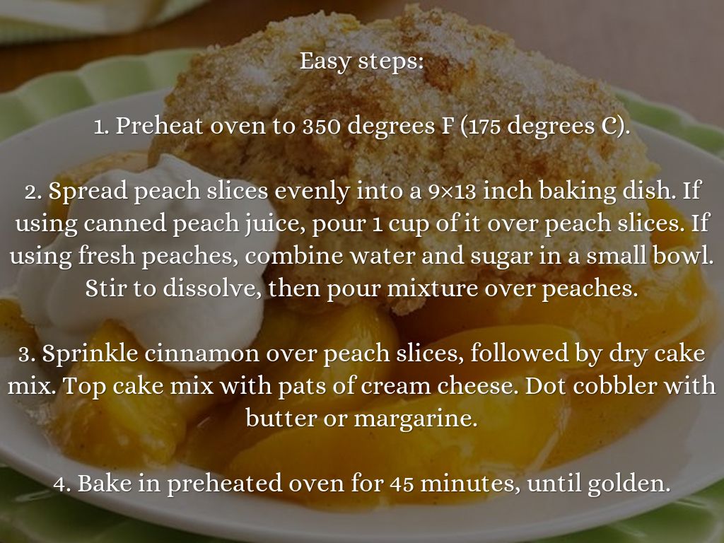 3. Sprinkle cinnamon over peach slices, followed by dry cake mix. Top cake mix with pats of cream cheese. Dot cobbler with butter or margarine.