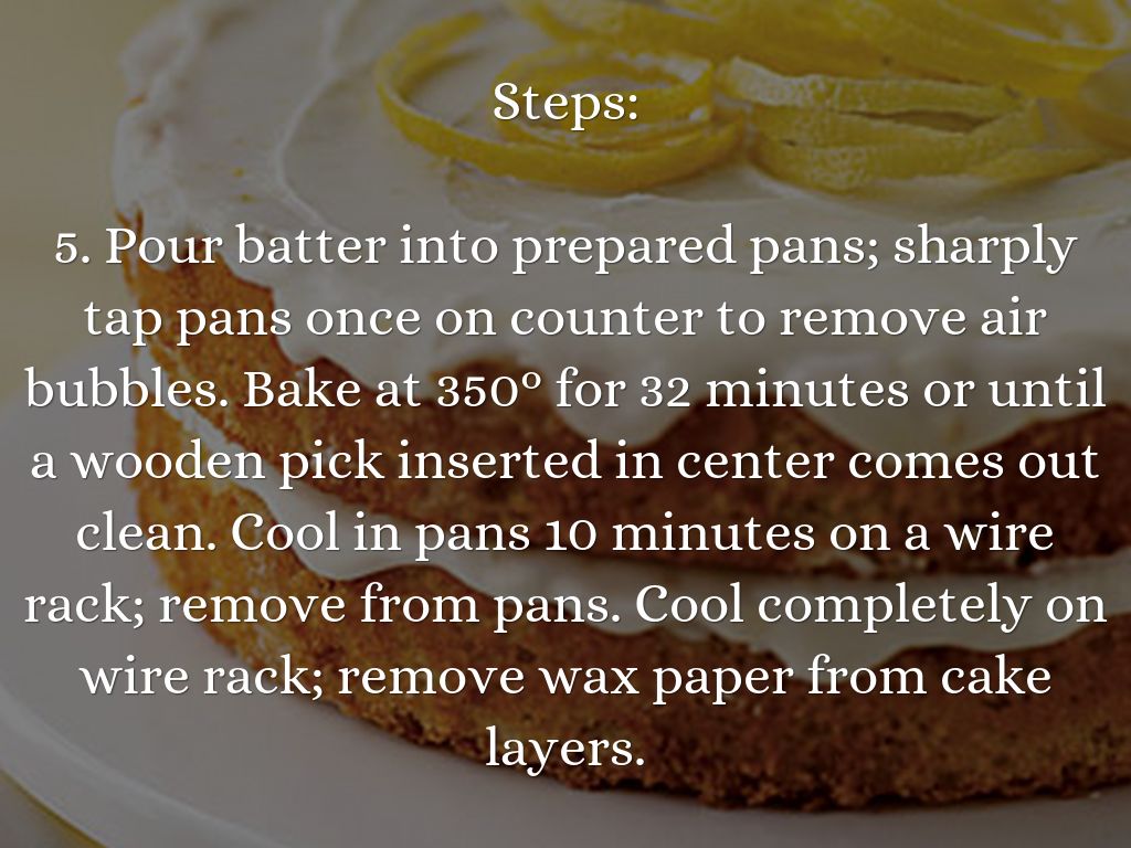 5. Pour batter into prepared pans; sharply tap pans once on counter to remove air bubbles. Bake at 350° for 32 minutes or until a wooden pick inserted in center comes out clean. Cool in pans 10 minutes on a wire rack; remove from pans. Cool completely on wire rack; remove wax paper from cake layers.