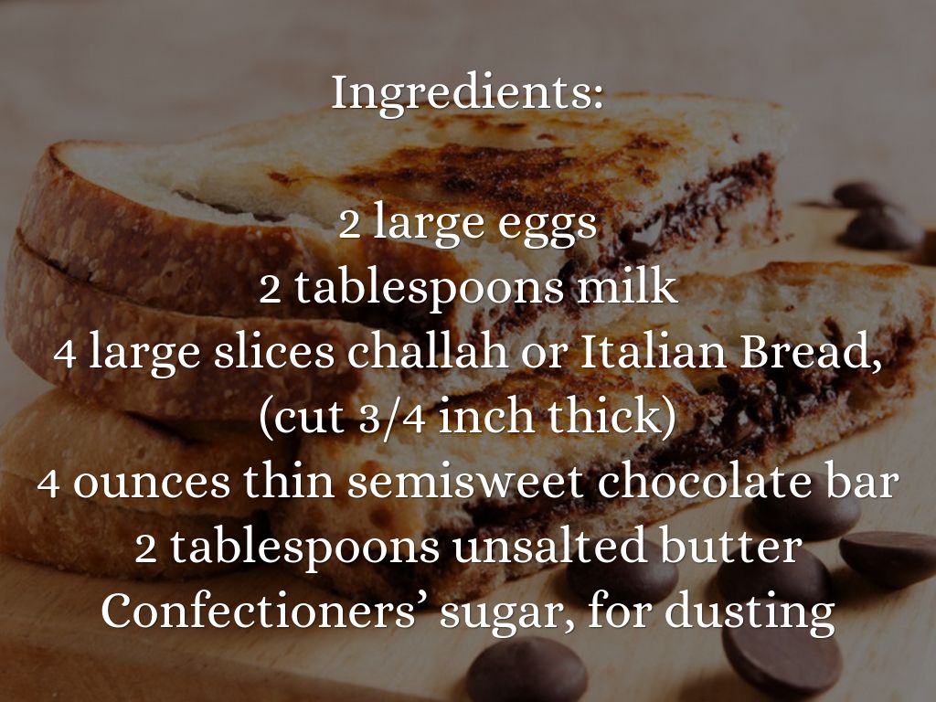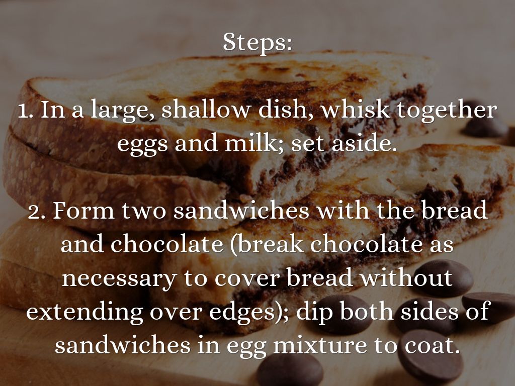 2. Form two sandwiches with the bread and chocolate (break chocolate as necessary to cover bread without extending over edges); dip both sides of sandwiches in egg mixture to coat.