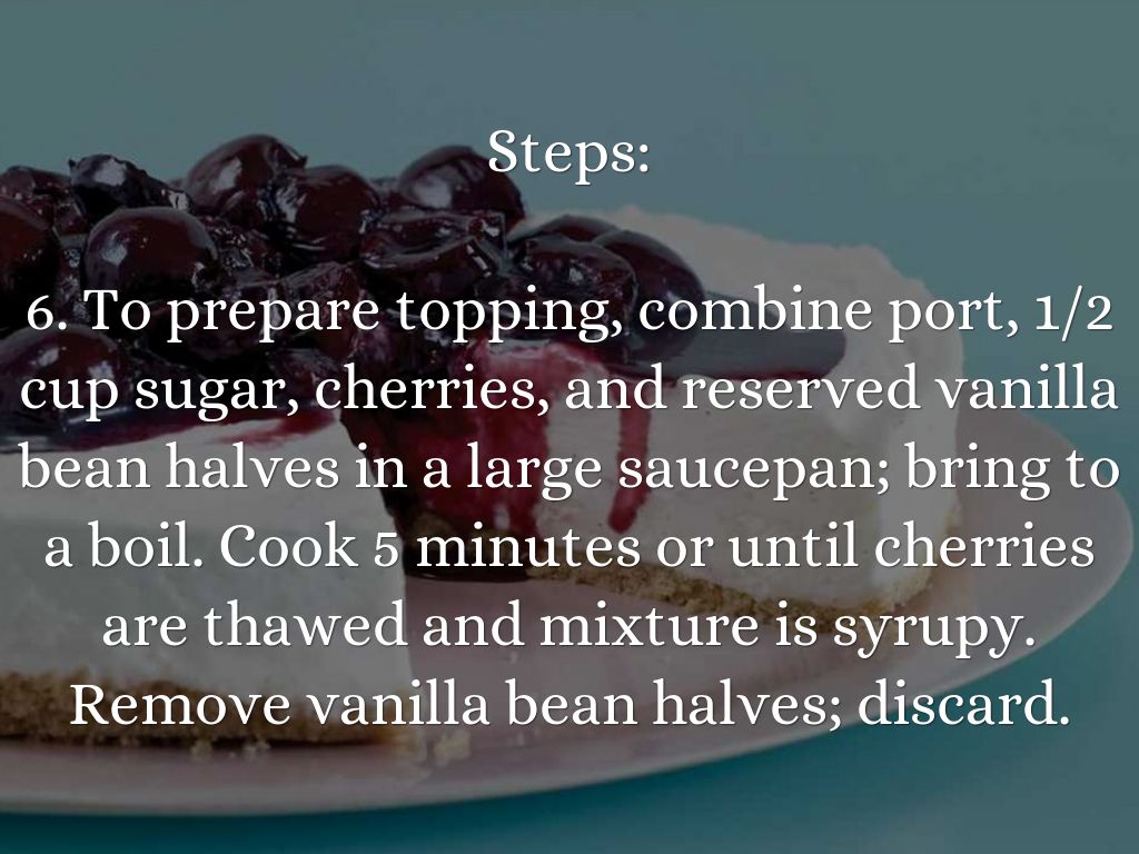 6. To prepare topping, combine port, 1/2 cup sugar, cherries, and reserved vanilla bean halves in a large saucepan; bring to a boil. Cook 5 minutes or until cherries are thawed and mixture is syrupy. Remove vanilla bean halves; discard.