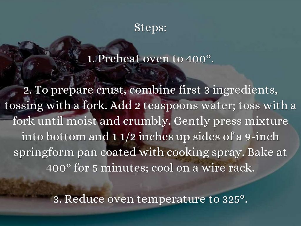 2. To prepare crust, combine first 3 ingredients, tossing with a fork. Add 2 teaspoons water; toss with a fork until moist and crumbly. Gently press mixture into bottom and 1 1/2 inches up sides of a 9-inch springform pan coated with cooking spray. Bake at 400° for 5 minutes; cool on a wire rack.