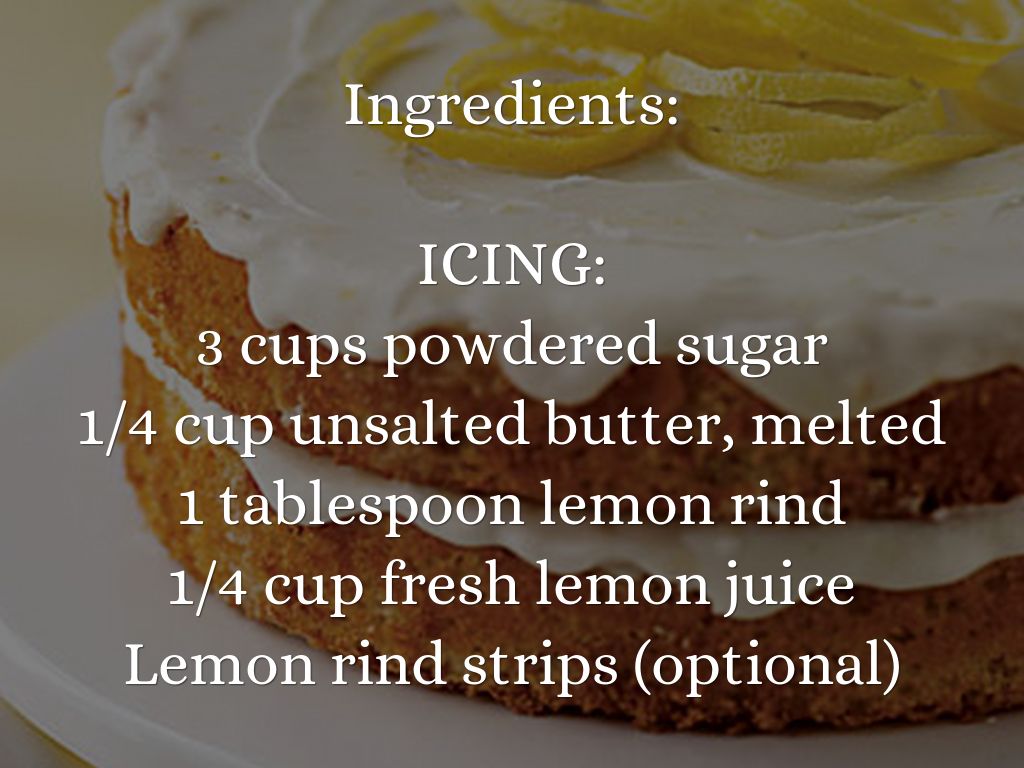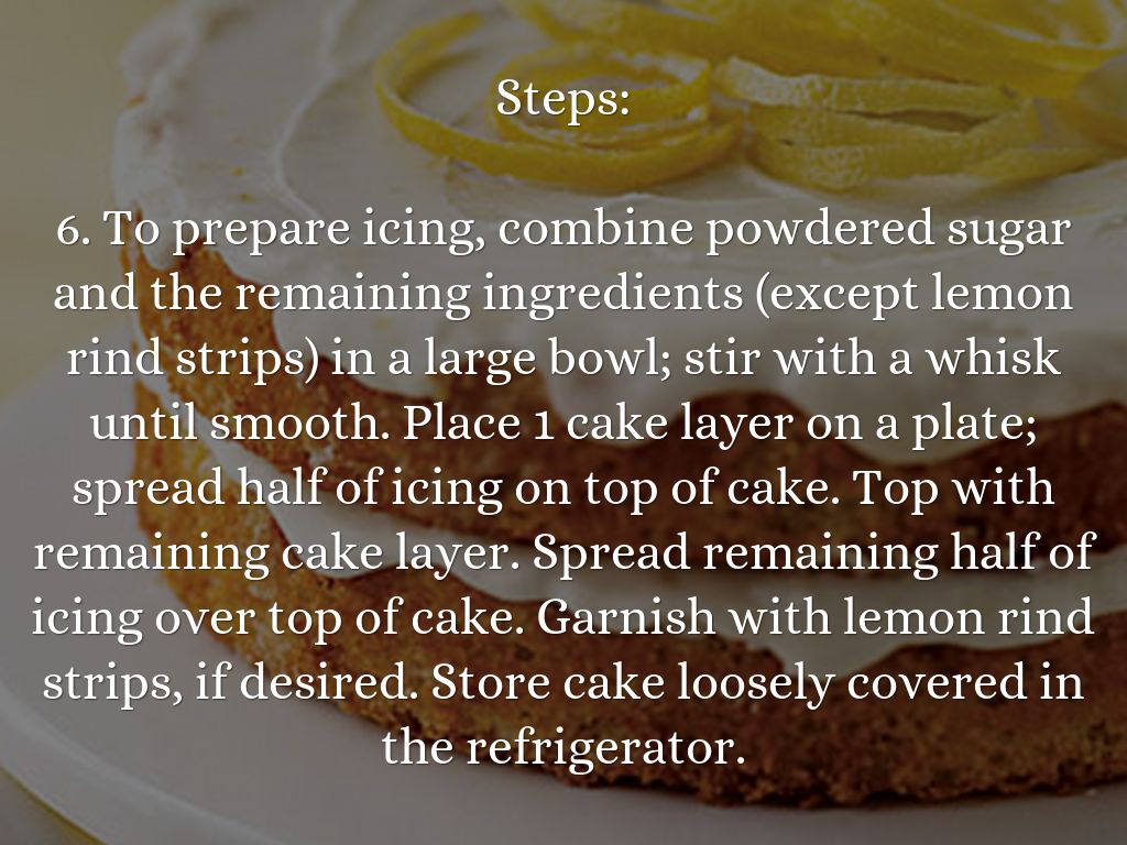 6. To prepare icing, combine powdered sugar and the remaining ingredients (except lemon rind strips) in a large bowl; stir with a whisk until smooth. Place 1 cake layer on a plate; spread half of icing on top of cake. Top with remaining cake layer. Spread remaining half of icing over top of cake. Garnish with lemon rind strips, if desired. Store cake loosely covered in the refrigerator.