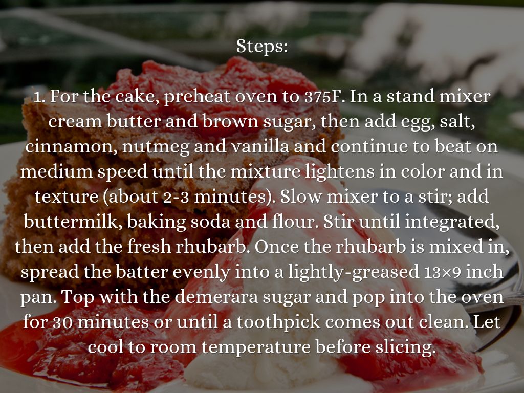 1. For the cake, preheat oven to 375F. In a stand mixer cream butter and brown sugar, then add egg, salt, cinnamon, nutmeg and vanilla and continue to beat on medium speed until the mixture lightens in color and in texture (about 2-3 minutes). Slow mixer to a stir; add buttermilk, baking soda and flour. Stir until integrated, then add the fresh rhubarb. Once the rhubarb is mixed in, spread the batter evenly into a lightly-greased 13×9 inch pan. Top with the demerara sugar and pop into the oven for 30 minutes or until a toothpick comes out clean. Let cool to room temperature before slicing.