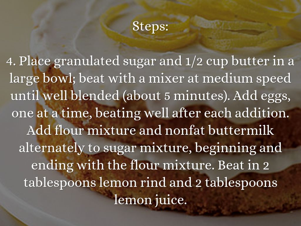 4. Place granulated sugar and 1/2 cup butter in a large bowl; beat with a mixer at medium speed until well blended (about 5 minutes). Add eggs, one at a time, beating well after each addition. Add flour mixture and nonfat buttermilk alternately to sugar mixture, beginning and ending with the flour mixture. Beat in 2 tablespoons lemon rind and 2 tablespoons lemon juice.