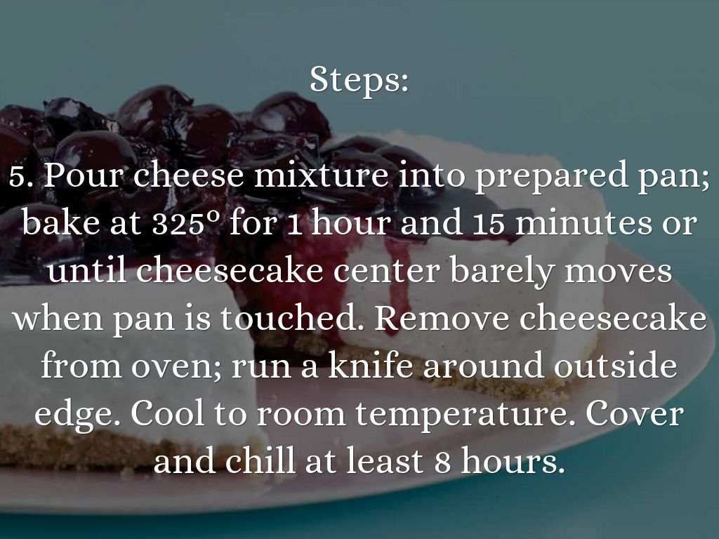 5. Pour cheese mixture into prepared pan; bake at 325° for 1 hour and 15 minutes or until cheesecake center barely moves when pan is touched. Remove cheesecake from oven; run a knife around outside edge. Cool to room temperature. Cover and chill at least 8 hours.