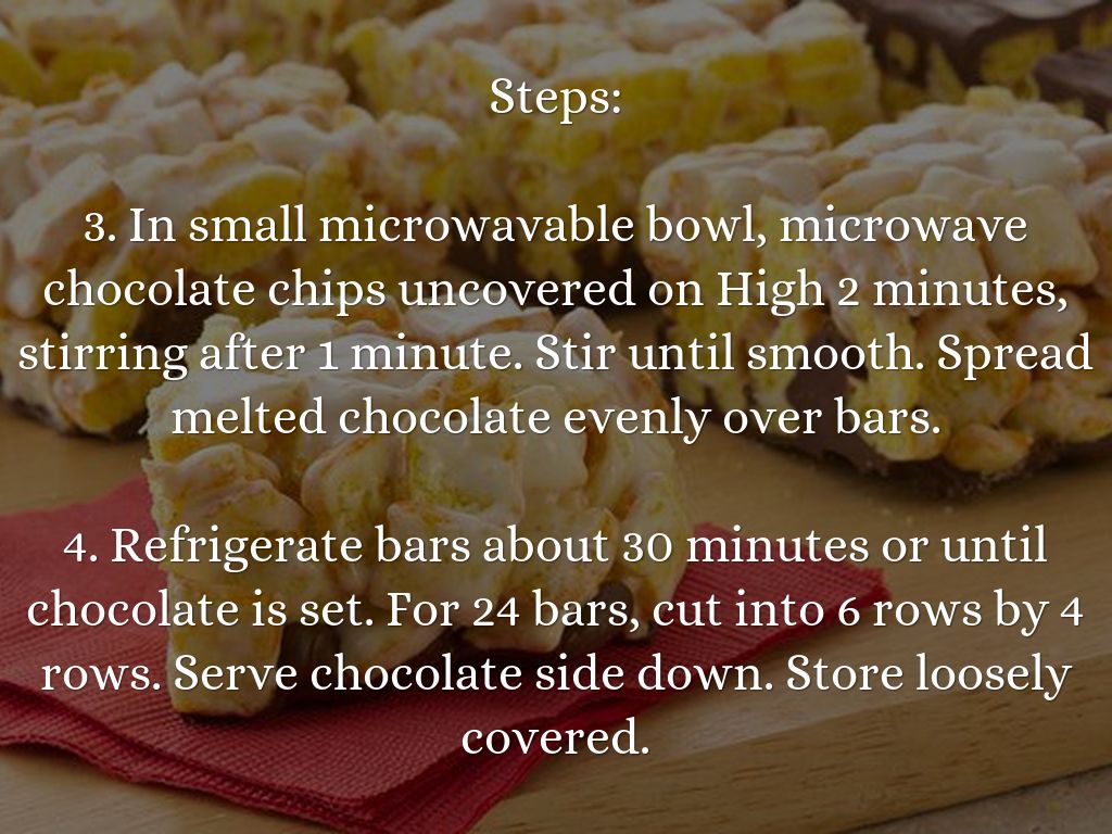 3. In small microwavable bowl, microwave chocolate chips uncovered on High 2 minutes, stirring after 1 minute. Stir until smooth. Spread melted chocolate evenly over bars.