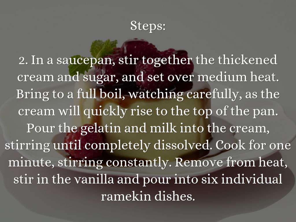 2. In a saucepan, stir together the thickened cream and sugar, and set over medium heat. Bring to a full boil, watching carefully, as the cream will quickly rise to the top of the pan. Pour the gelatin and milk into the cream, stirring until completely dissolved. Cook for one minute, stirring constantly. Remove from heat, stir in the vanilla and pour into six individual ramekin dishes.