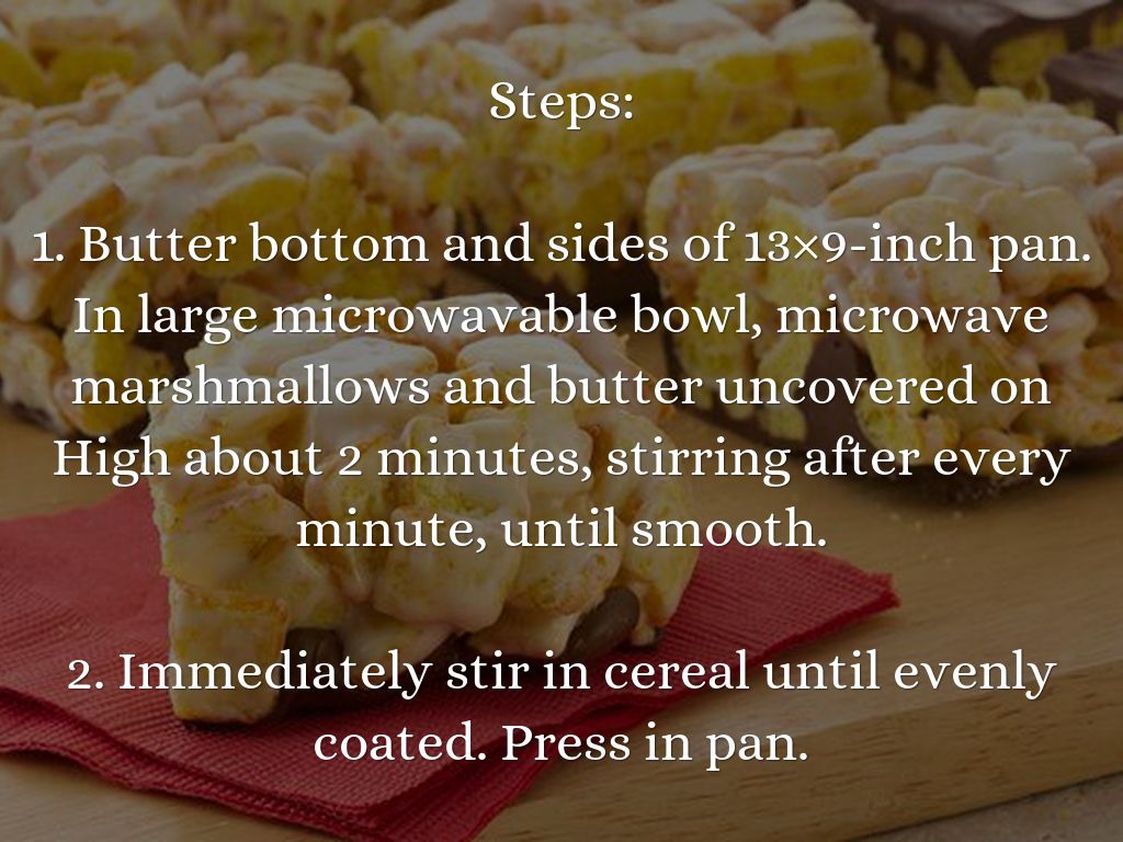1. Butter bottom and sides of 13×9-inch pan. In large microwavable bowl, microwave marshmallows and butter uncovered on High about 2 minutes, stirring after every minute, until smooth.