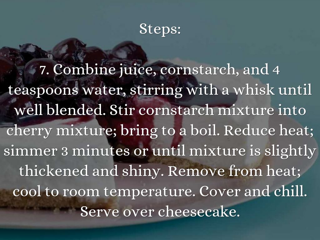 7. Combine juice, cornstarch, and 4 teaspoons water, stirring with a whisk until well blended. Stir cornstarch mixture into cherry mixture; bring to a boil. Reduce heat; simmer 3 minutes or until mixture is slightly thickened and shiny. Remove from heat; cool to room temperature. Cover and chill. Serve over cheesecake.