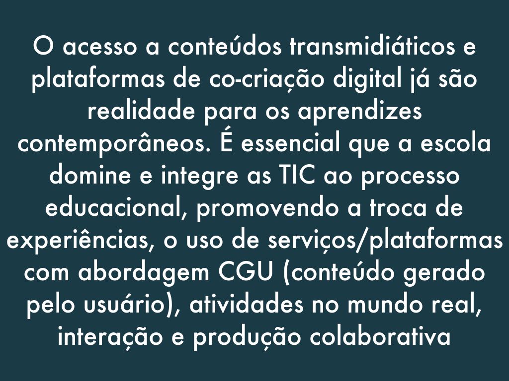 O acesso a conteúdos transmidiáticos e plataformas de co-criação digital já são realidade para os aprendizes contemporâneos. É essencial que a escola domine e integre as TIC ao processo educacional, promovendo a troca de experiências, o uso de serviços/plataformas com abordagem CGU (conteúdo gerado pelo usuário), atividades no mundo real, interação e produção colaborativa
