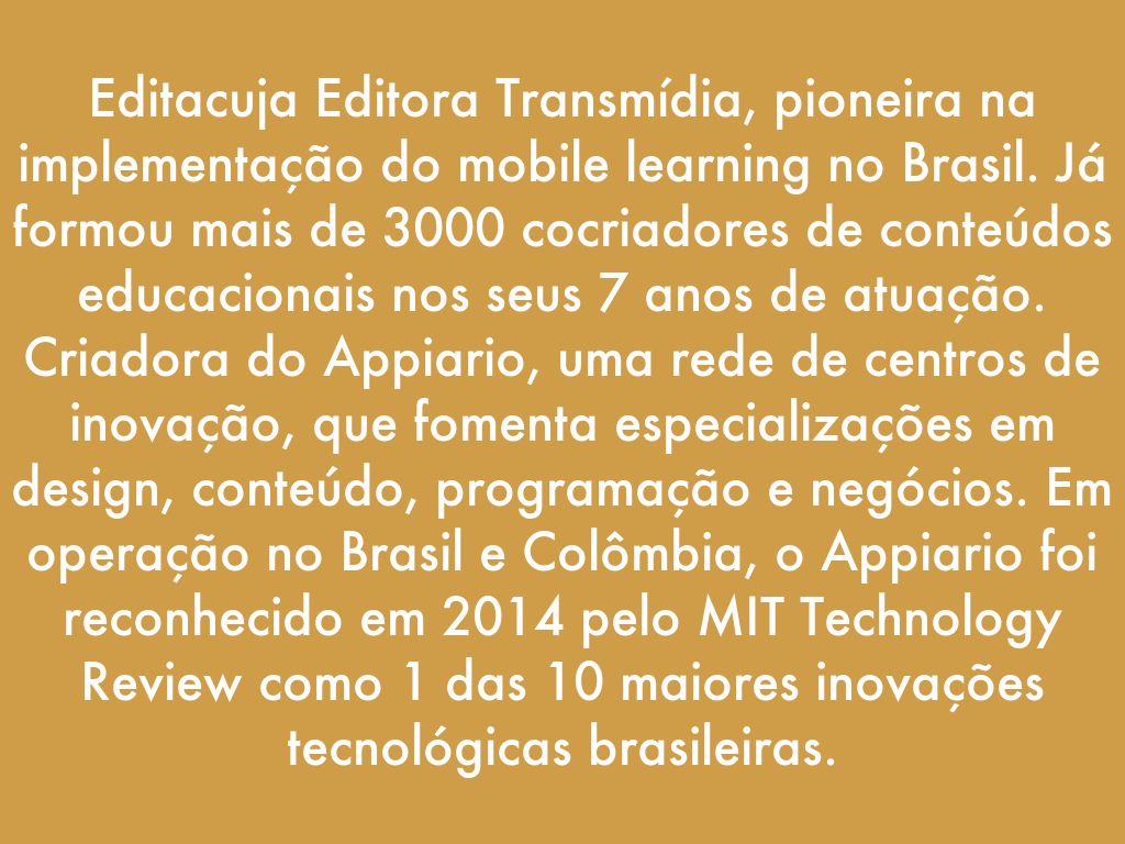 Editacuja Editora Transmídia, pioneira na implementação do mobile learning no Brasil. Já formou mais de 3000 cocriadores de conteúdos educacionais nos seus 7 anos de atuação. Criadora do Appiario, uma rede de centros de inovação, que fomenta especializações em design, conteúdo, programação e negócios. Em operação no Brasil e Colômbia, o Appiario foi reconhecido em 2014 pelo MIT Technology Review como 1 das 10 maiores inovações tecnológicas brasileiras.