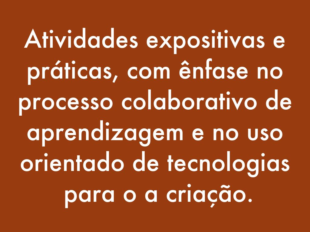 Atividades expositivas e práticas, com ênfase no processo colaborativo de aprendizagem e no uso orientado de tecnologias para o a criação.