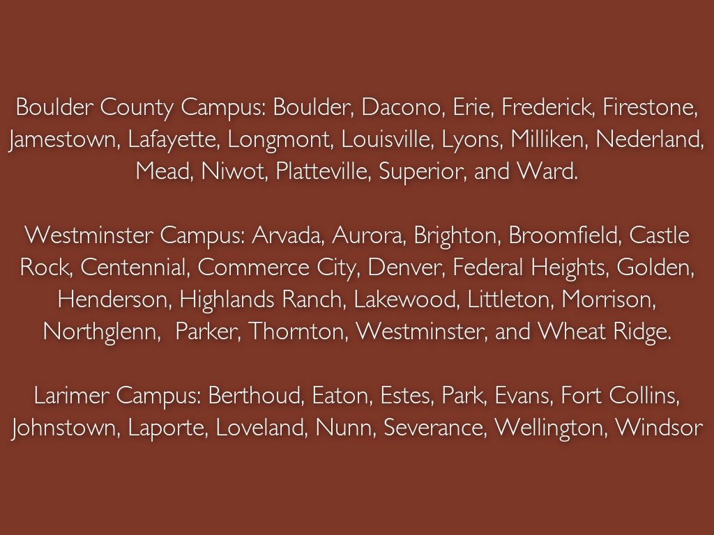 Boulder County Campus: Boulder, Dacono, Erie, Frederick, Firestone, Jamestown, Lafayette, Longmont, Louisville, Lyons, Milliken, Nederland, Mead, Niwot, Platteville, Superior, and Ward.