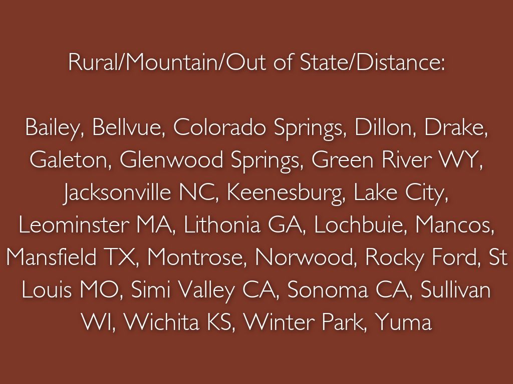 Bailey, Bellvue, Colorado Springs, Dillon, Drake, Galeton, Glenwood Springs, Green River WY, Jacksonville NC, Keenesburg, Lake City, Leominster MA, Lithonia GA, Lochbuie, Mancos, Mansfield TX, Montrose, Norwood, Rocky Ford, St Louis MO, Simi Valley CA, Sonoma CA, Sullivan WI, Wichita KS, Winter Park, Yuma