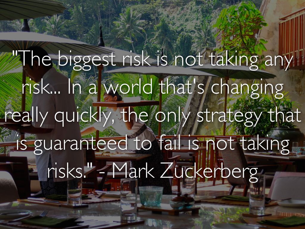 "The biggest risk is not taking any risk... In a world that's changing really quickly, the only strategy that is guaranteed to fail is not taking risks." - Mark Zuckerberg
