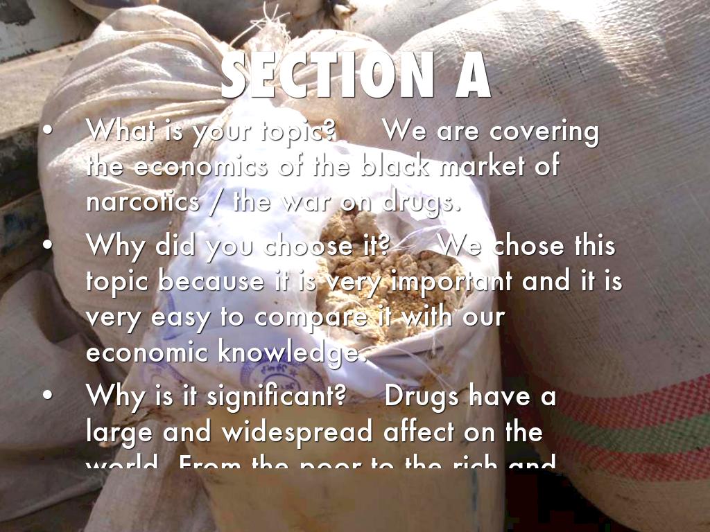 What is your topic? We are covering the economics of the black market of narcotics / the war on drugs.