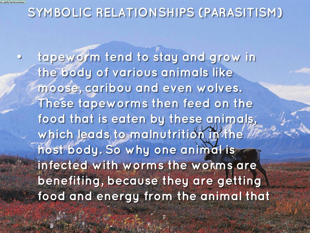 • tapeworm tend to stay and grow in the body of various animals like moose, caribou and even wolves. These tapeworms then feed on the food that is eaten by these animals, which leads to malnutrition in the host body. So why one animal is infected with worms the worms are benefiting, because they are getting food and energy from the animal that it's inside of.
