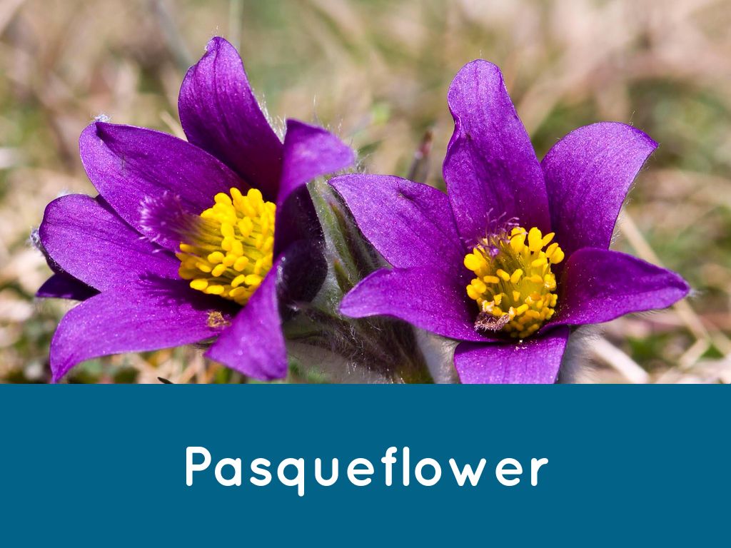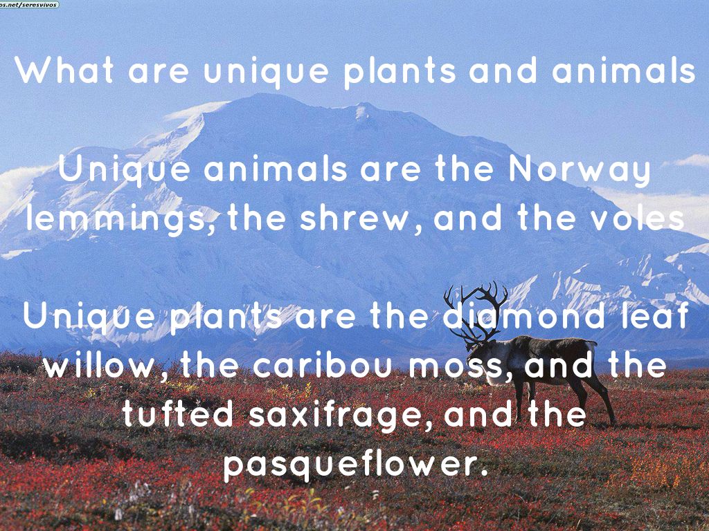 Unique plants are the diamond leaf willow, the caribou moss, and the tufted saxifrage, and the pasqueflower.