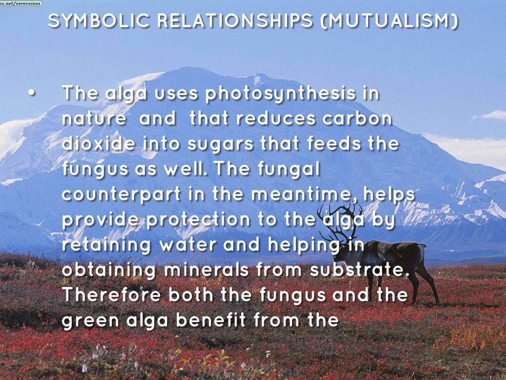 • The alga uses photosynthesis in nature and that reduces carbon dioxide into sugars that feeds the fungus as well. The fungal counterpart in the meantime, helps provide protection to the alga by retaining water and helping in obtaining minerals from substrate. Therefore both the fungus and the green alga benefit from the relationship, making it mutualism. Very useful for feeding other things around the Tundra as well as give protection.