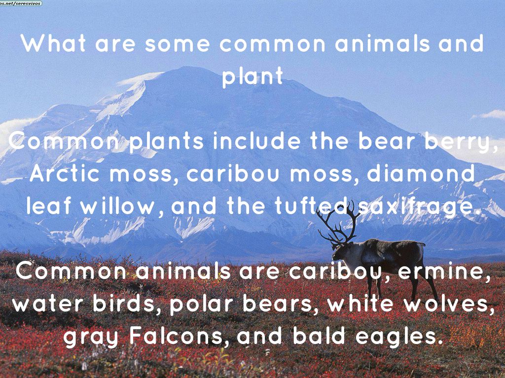 Common animals are caribou, ermine, water birds, polar bears, white wolves, gray Falcons, and bald eagles.