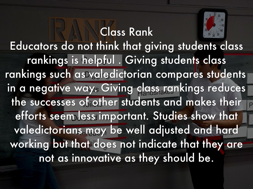 Educators do not think that giving students class rankings is helpful . Giving students class rankings such as valedictorian compares students in a negative way. Giving class rankings reduces the successes of other students and makes their efforts seem less important. Studies show that valedictorians may be well adjusted and hard working but that does not indicate that they are not as innovative as they should be.