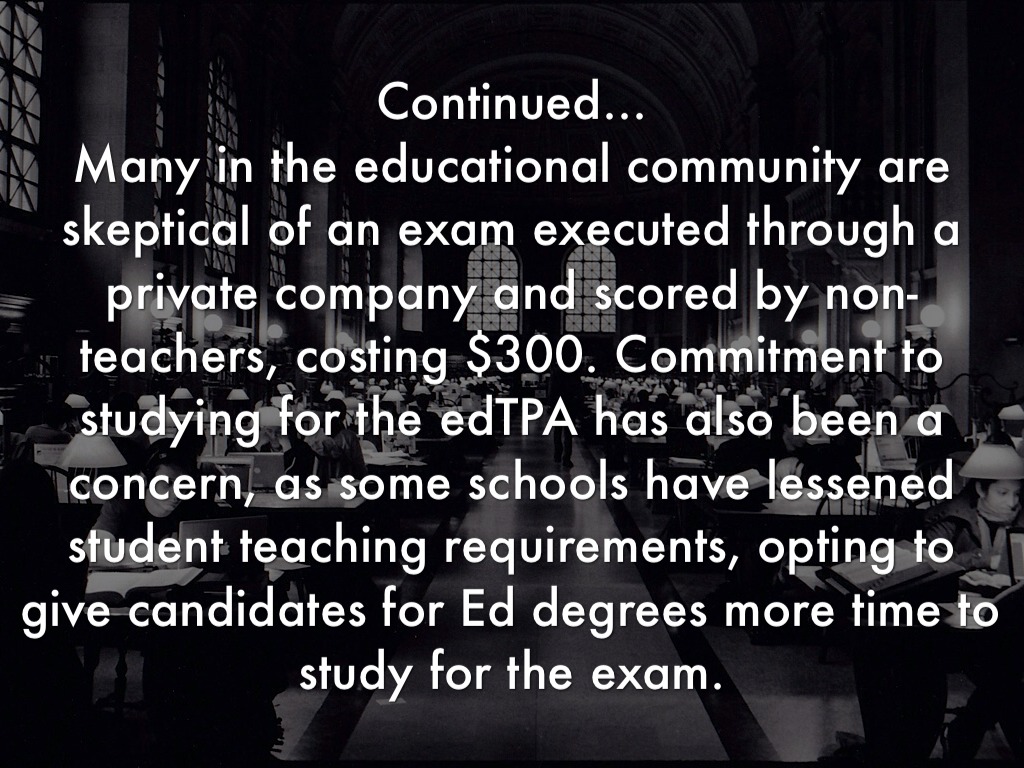 Many in the educational community are skeptical of an exam executed through a private company and scored by non-teachers, costing $300. Commitment to studying for the edTPA has also been a concern, as some schools have lessened student teaching requirements, opting to give candidates for Ed degrees more time to study for the exam.