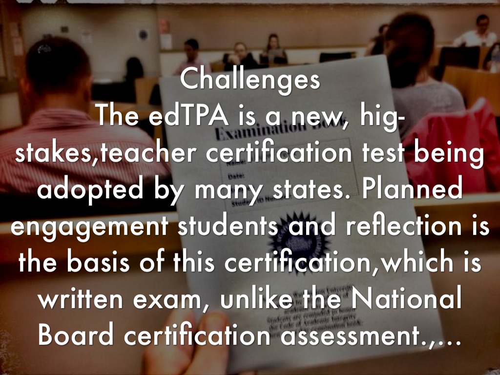 The edTPA is a new, hig-stakes,teacher certification test being adopted by many states. Planned engagement students and reflection is the basis of this certification,which is written exam, unlike the National Board certification assessment.,...