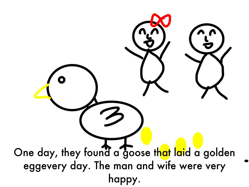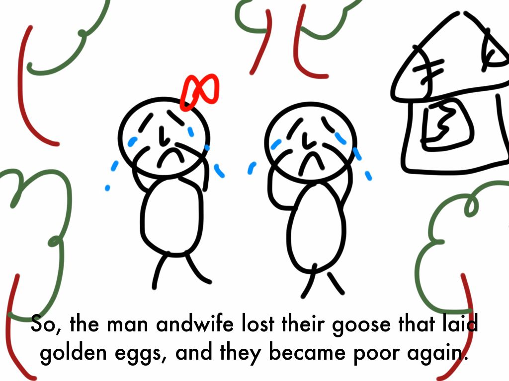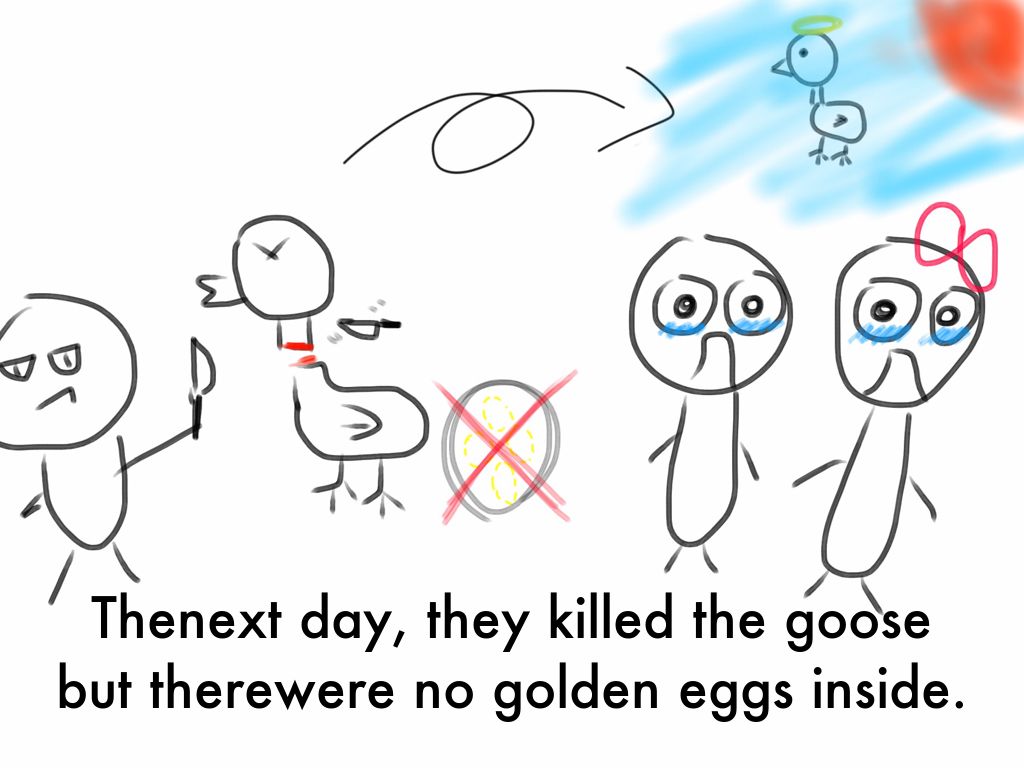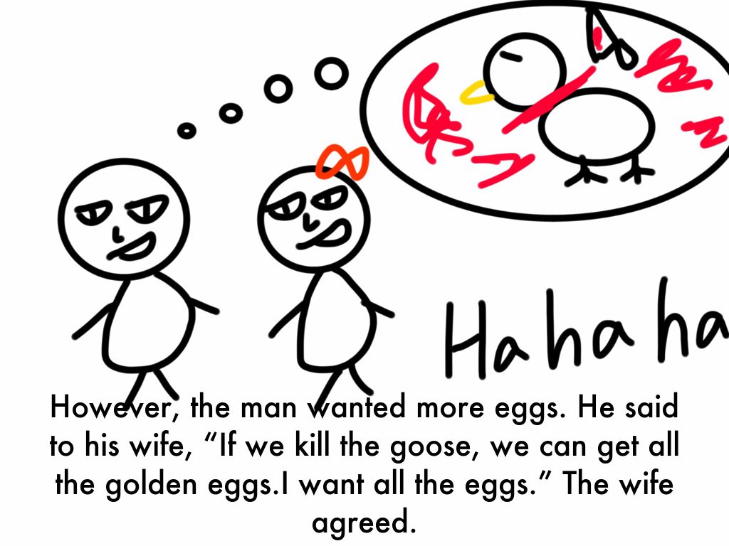 However, the man wanted more eggs. He said to his wife, “If we kill the goose, we can get all the golden eggs.