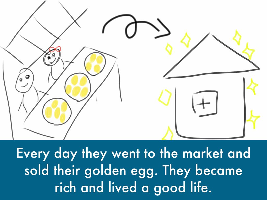 Every day they went to the market and sold their golden egg. They became rich and lived a good life.