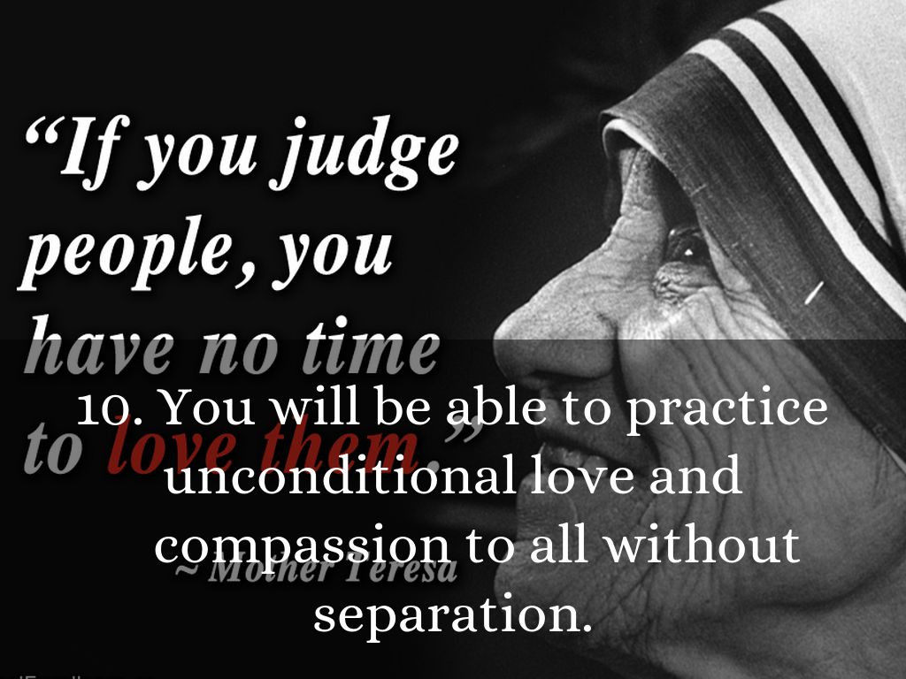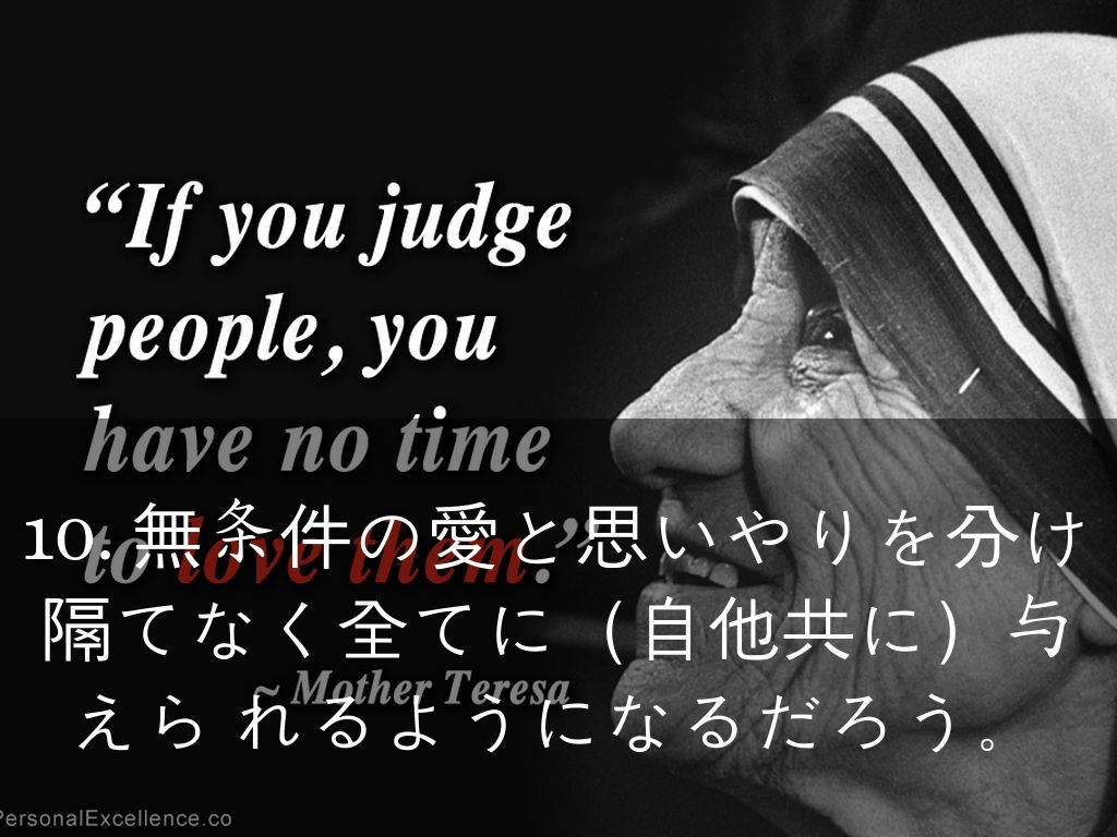 10. 無条件の愛と思いやりを分け隔てなく全てに(自他共に)与えら れるようになるだろう。
