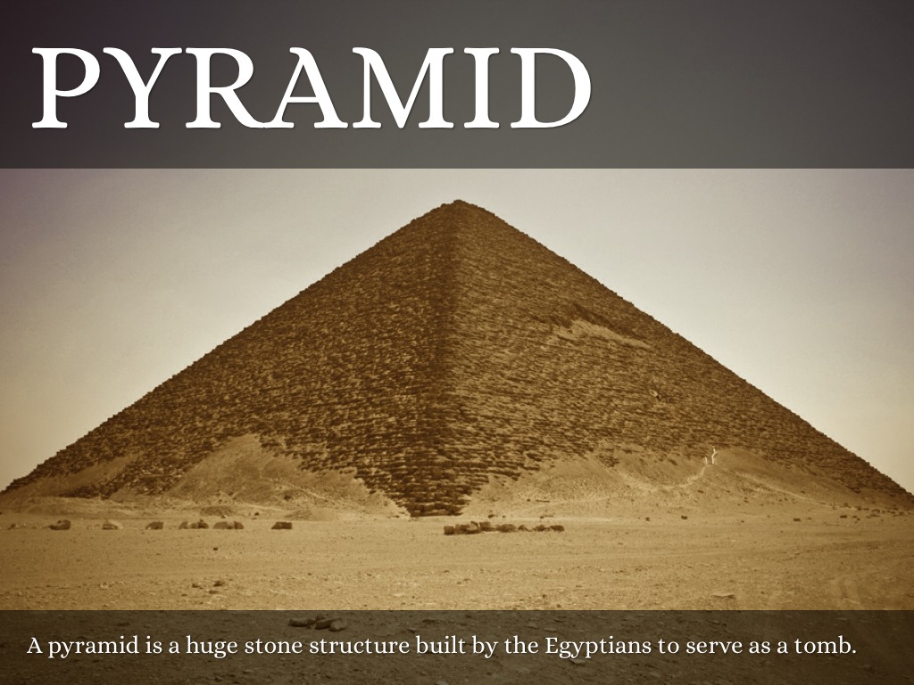 A pyramid is a huge stone structure built by the Egyptians to serve as a tomb.