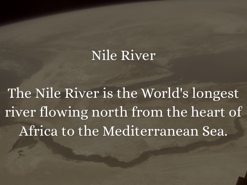The Nile River is the World's longest river flowing north from the heart of Africa to the Mediterranean Sea.