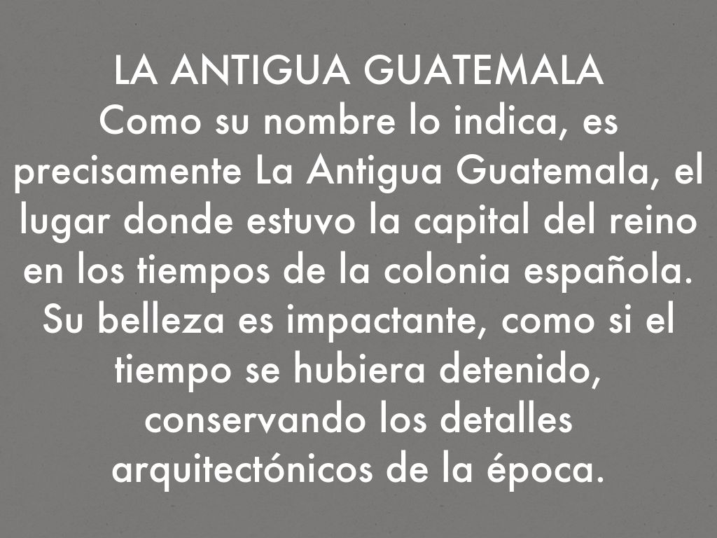 Como su nombre lo indica, es precisamente La Antigua Guatemala, el lugar donde estuvo la capital del reino en los tiempos de la colonia española. Su belleza es impactante, como si el tiempo se hubiera detenido, conservando los detalles arquitectónicos de la época.