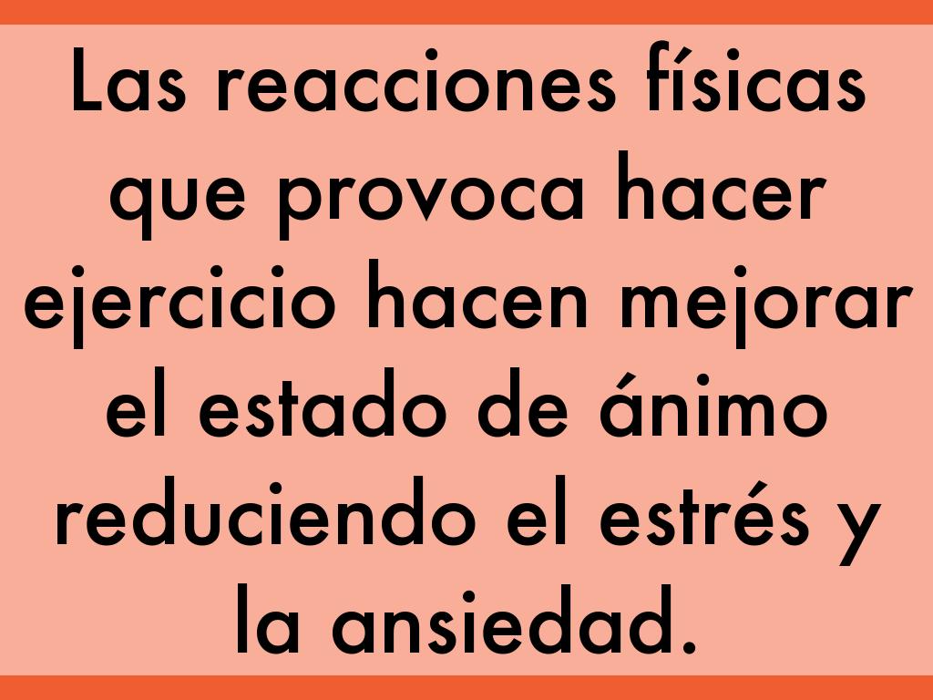 Las reacciones físicas que provoca hacer ejercicio hacen mejorar el estado de ánimo reduciendo el estrés y la ansiedad.