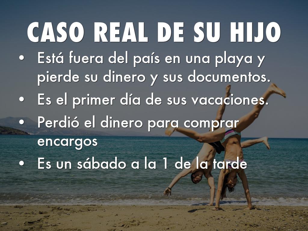 • Está fuera del país en una playa y pierde su dinero y sus documentos.