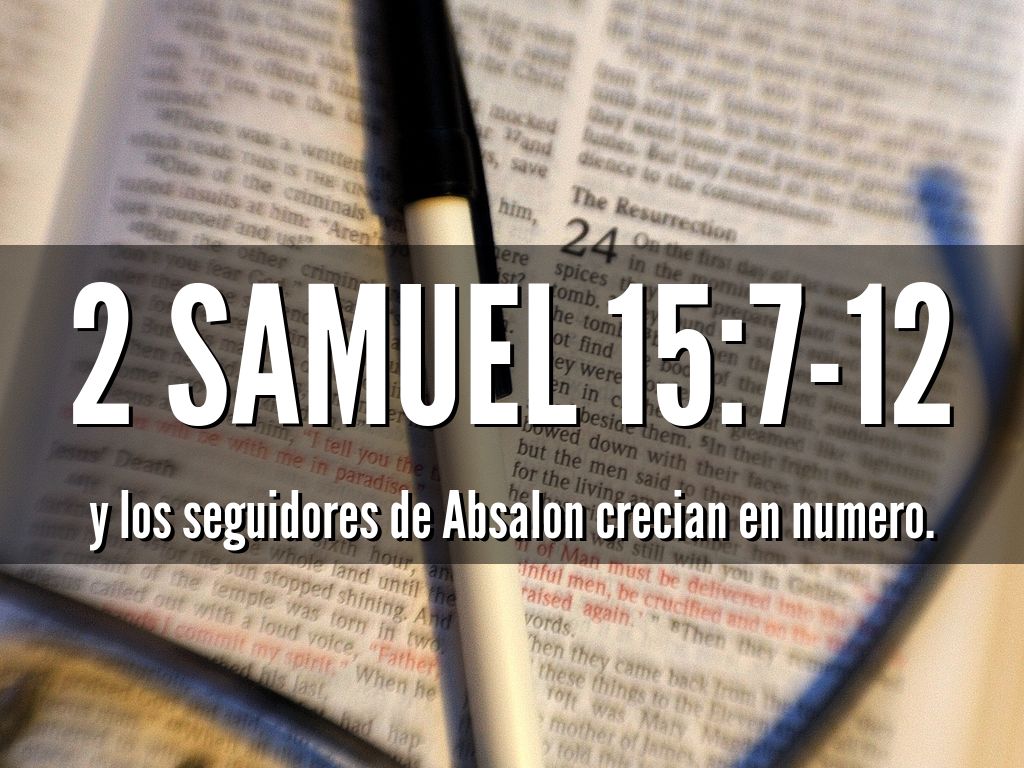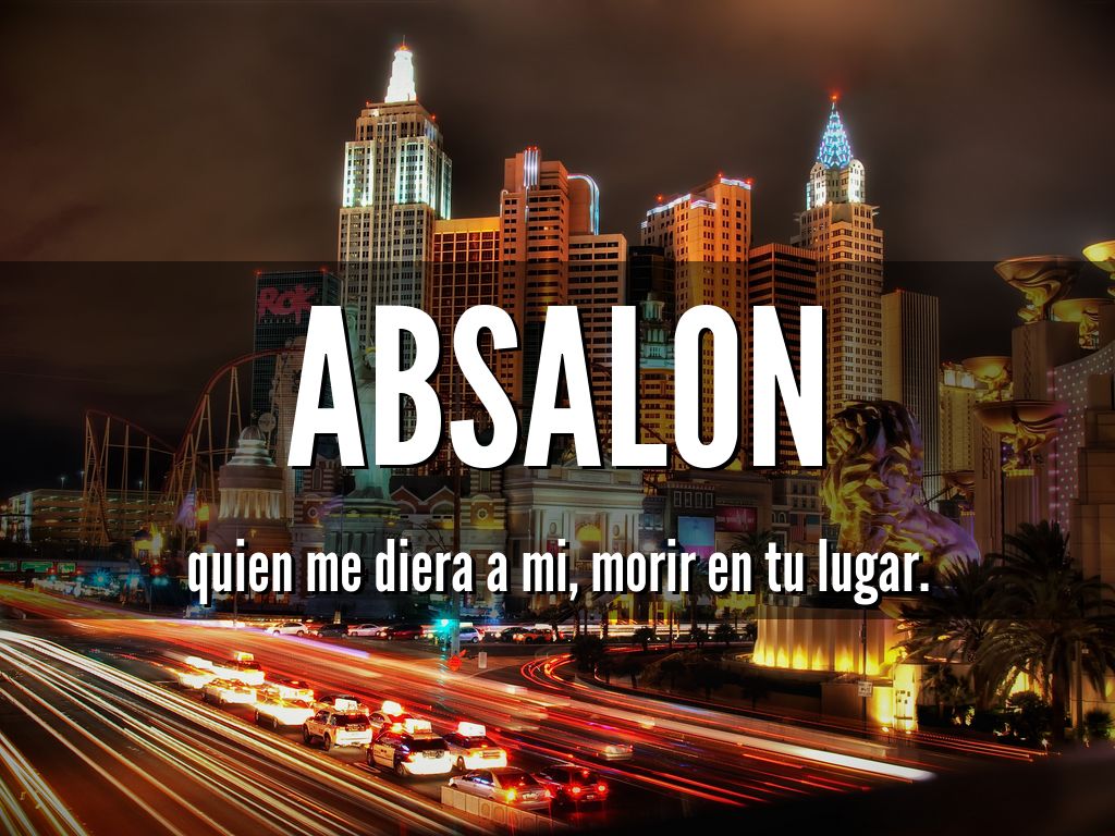 ABSALON, se parece a David mas que nadie, es un líder natural, un gran guerrero, es apuesto, la biblia lo describe como hermoso con una cabellera rubia y larga que pesaba casi dos Kilos y lo mas fascinante de ABSALON es que es un tipazo justo como su padre. Y ABSALON decide que si su Padre no va a hacer nada respecto a este crimen, Él lo hará, espera dos años sin decir nada.