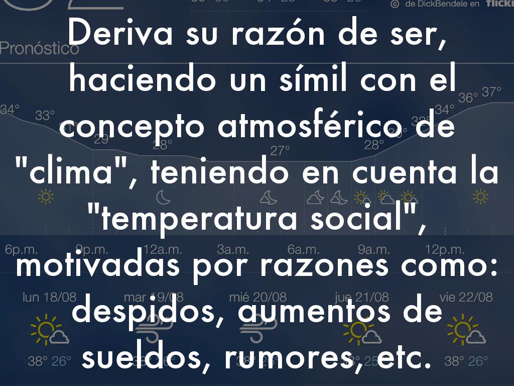 Deriva su razón de ser, haciendo un símil con el concepto atmosférico de "clima", teniendo en cuenta la "temperatura social", motivadas por razones como: despidos, aumentos de sueldos, rumores, etc.